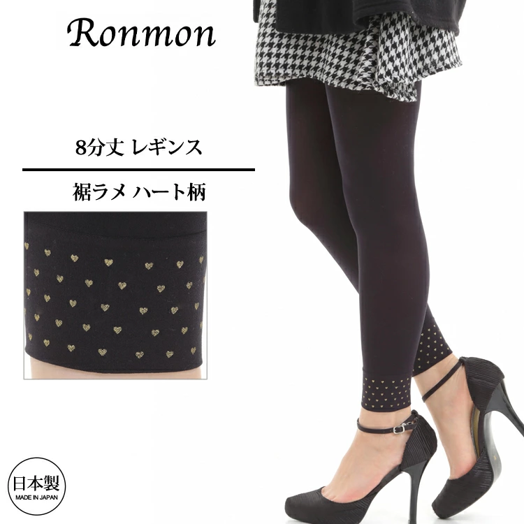 【日本製】8分丈 レギンス 裾ラメ ハート柄 大人可愛い 黒 スパッツ ダンス衣装 イベント 貝塚工場直送 M-L